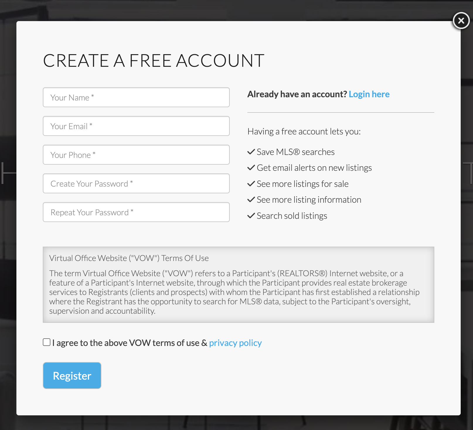 Pro tip: Check out Lead Capture Mode settings to choose how and when to prompt visitors to register for a free account while browsing MLS® searches and MLS® listings.