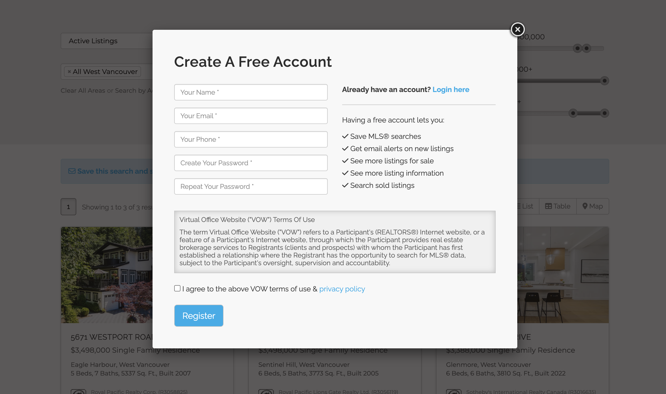 Visitors can freely browse MLS® searches and MLS® listings and only register when they choose to. No pop-ups or prompts are shown unless they initiate registration (for example, when saving a search).