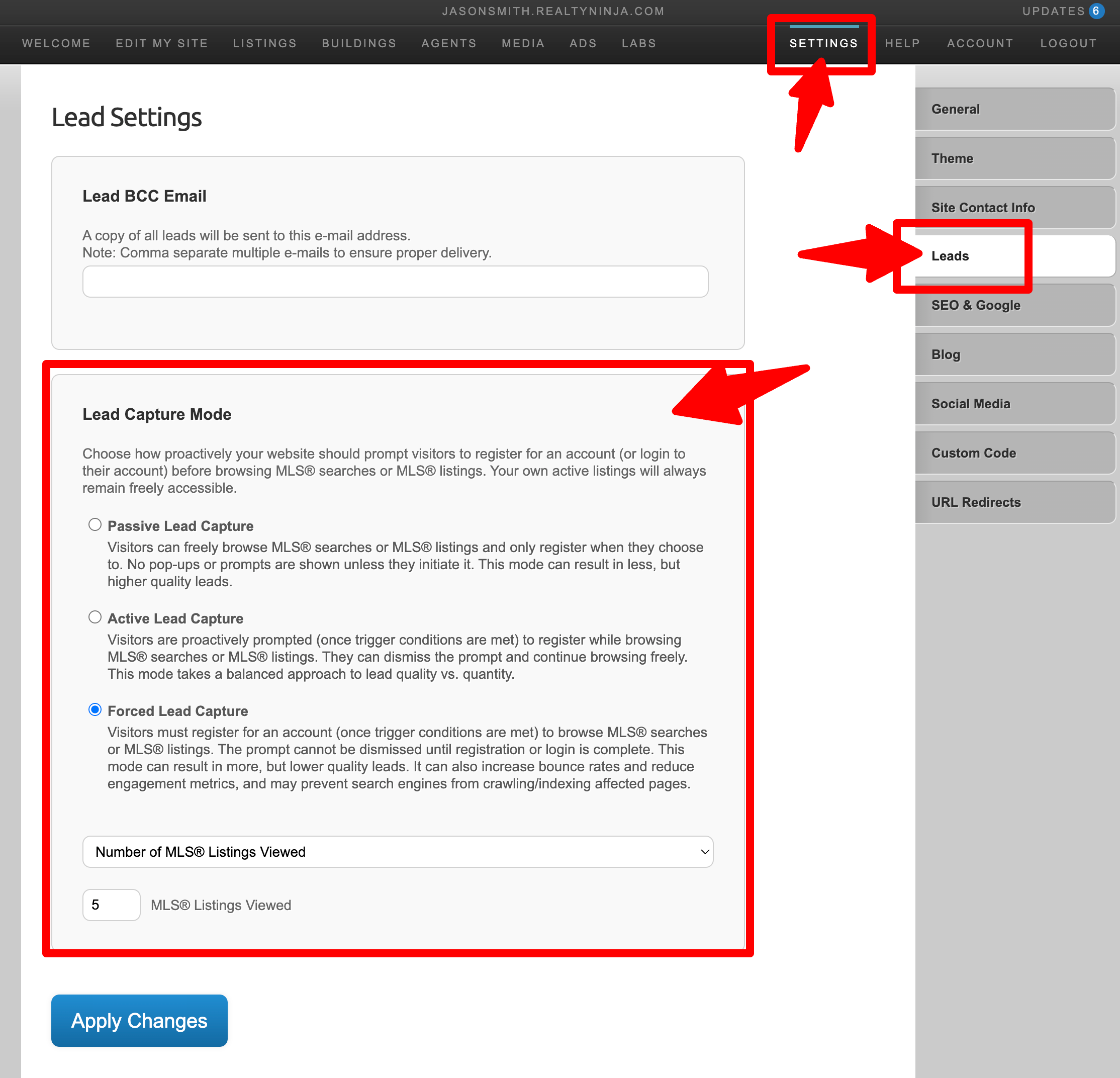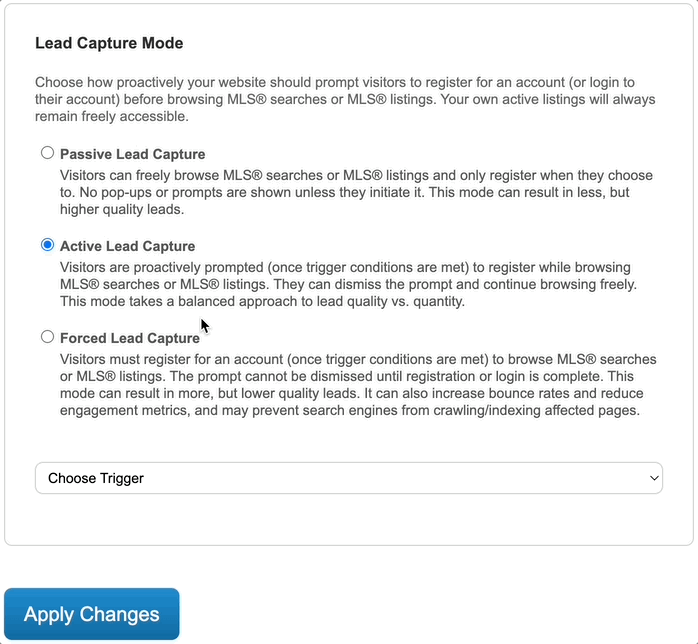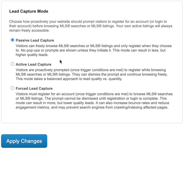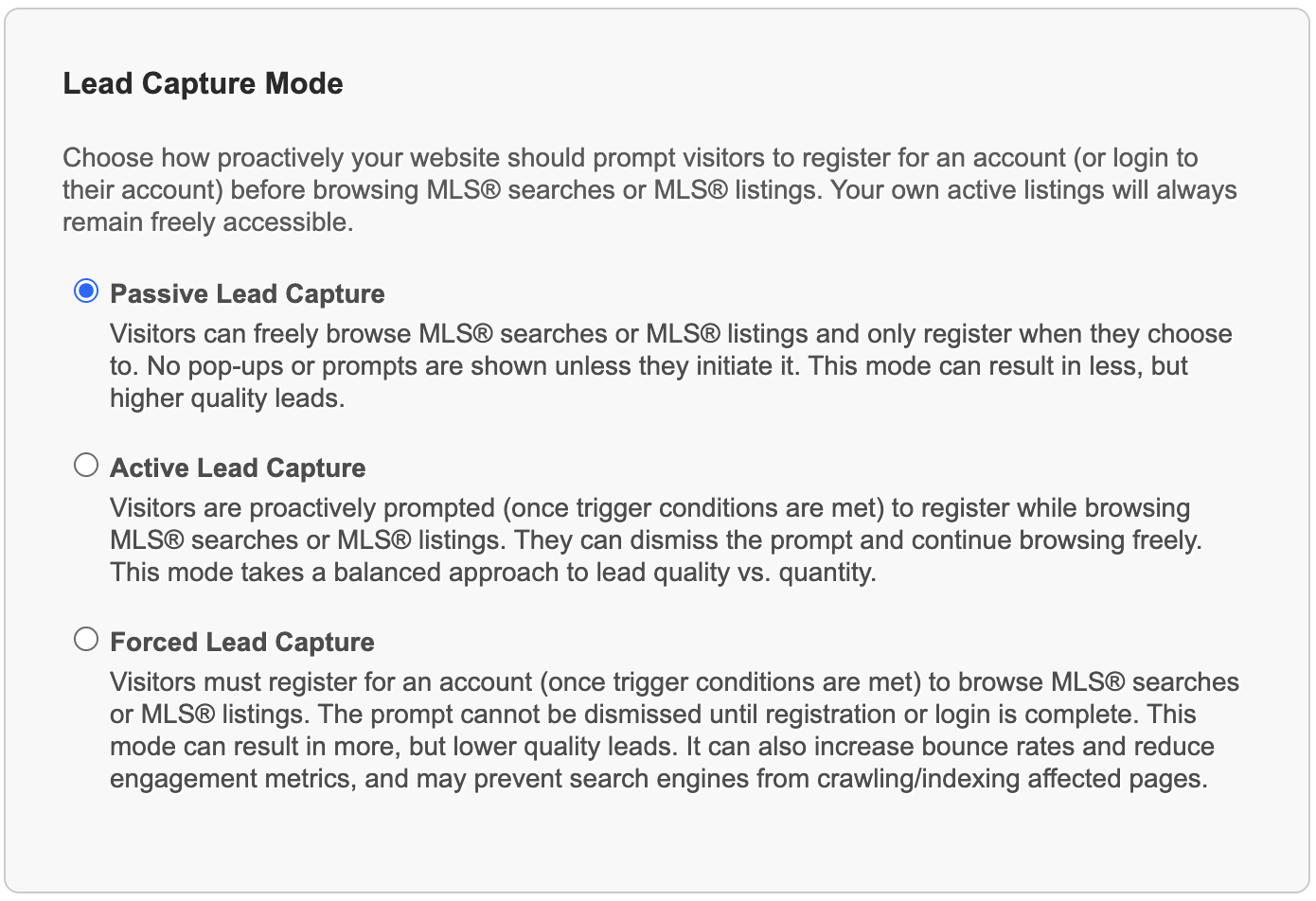 Prospective buyers often spend time browsing MLS® listings and performing MLS® searches on your site. Lead Capture Modes determine how proactively they’re prompted to register or log in to continue.