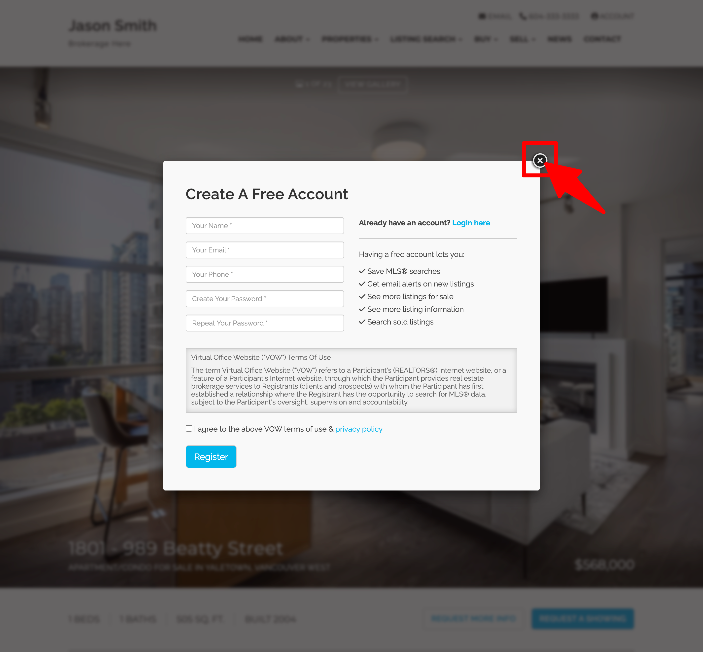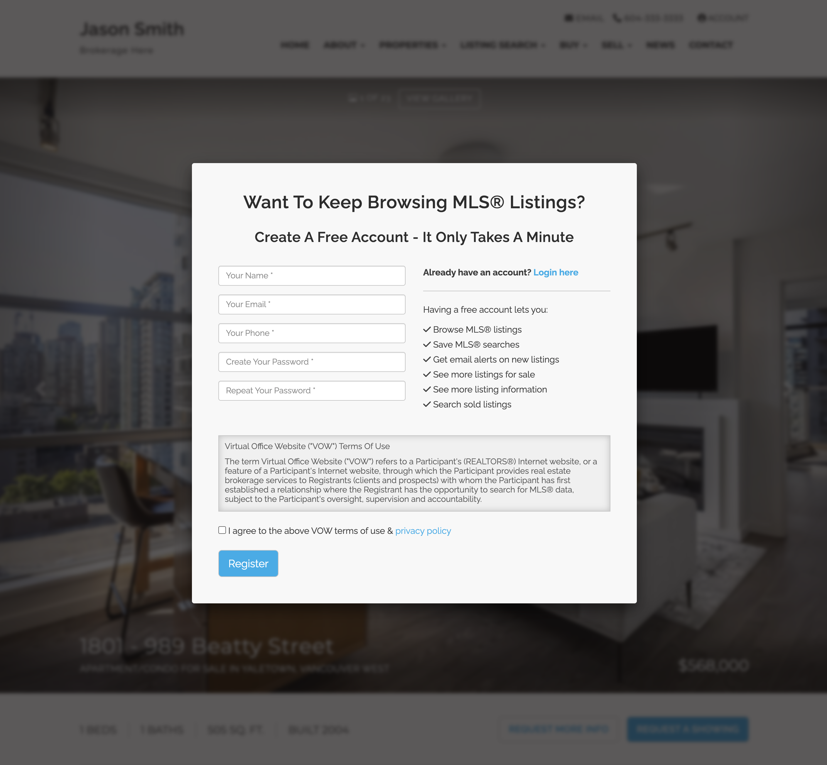 Visitors are prompted to register once specific conditions (triggers) are met while browsing MLS® listings or MLS® search pages. They can dismiss the prompt and continue browsing freely.